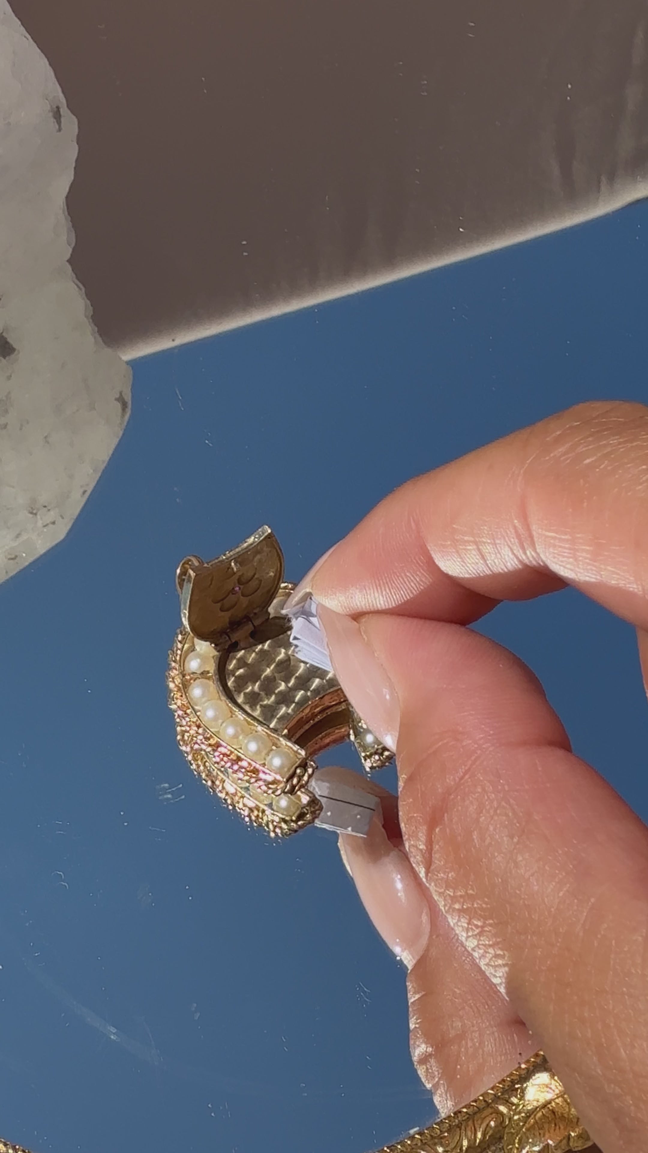 Meet the Attraction Locket, a vintage 1960s 14K gold double-sided horseshoe pendant adorned with 15 delicate seed pearls and sparkling pink and blue sapphires. The horseshoe has long symbolized luck, protection, and attraction, and this locket carries those energies in a wearable piece of history.